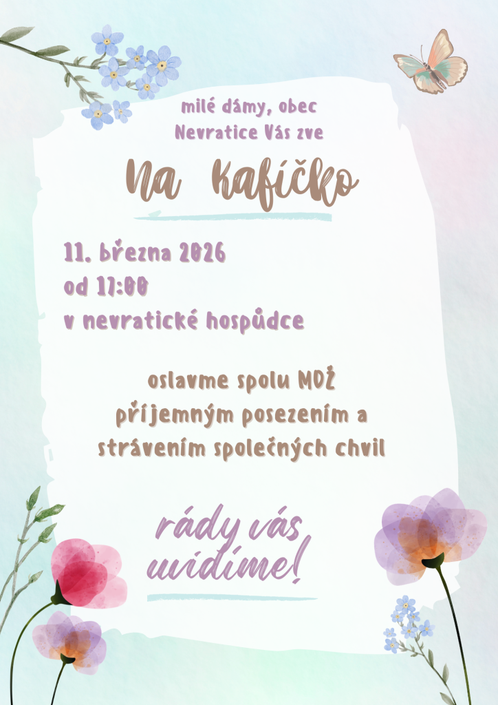 Obec Nevratice srdečně zve všechny dámy na akci 'Na Kafíčko', která se koná 11. března 2026 od 11:00. Přijďte do nevratické hospůdky oslavit Mezinárodní den žen příjemným posezením. Věříme, že si společně užijeme nezapomenutelné chvíle, vzájemné sdílení a hezké povídání.